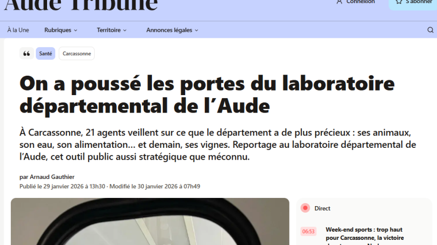 Un journaliste est venu sur le site du Laboratoire départemental de l'Aude (LDA), le lundi 26 janvier, afin de comprendre et de mettre en avant les missions du laboratoire, son équipe et la volonté politique forte associée à ce bel outil départemental ! Un article a été publié dans l'hebdomadaire cette semaine.